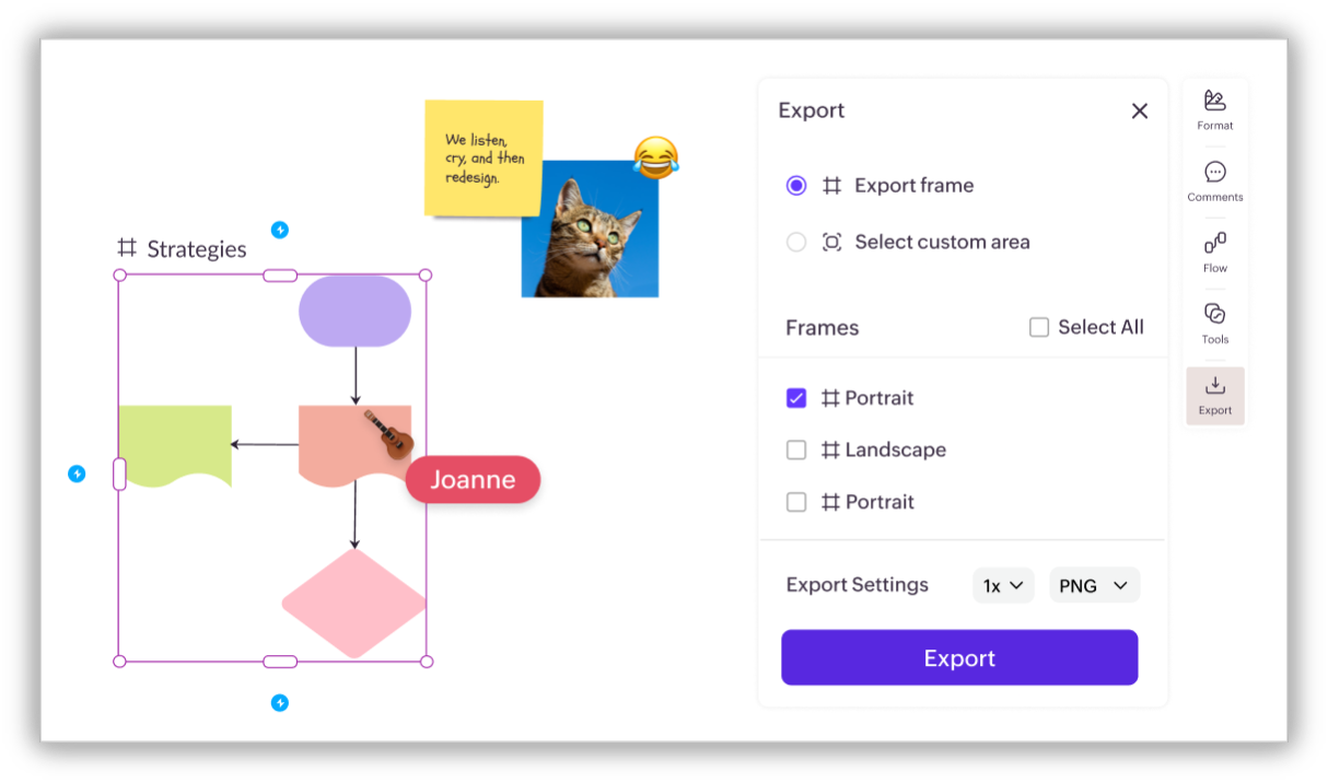 When the session ends, export any selected frame or area as a PNG or PDF. Share the Space with external stakeholders using a shareable link—no login required for viewers. You can also add guests with limited access for presenting or reviewing specific parts of the board.