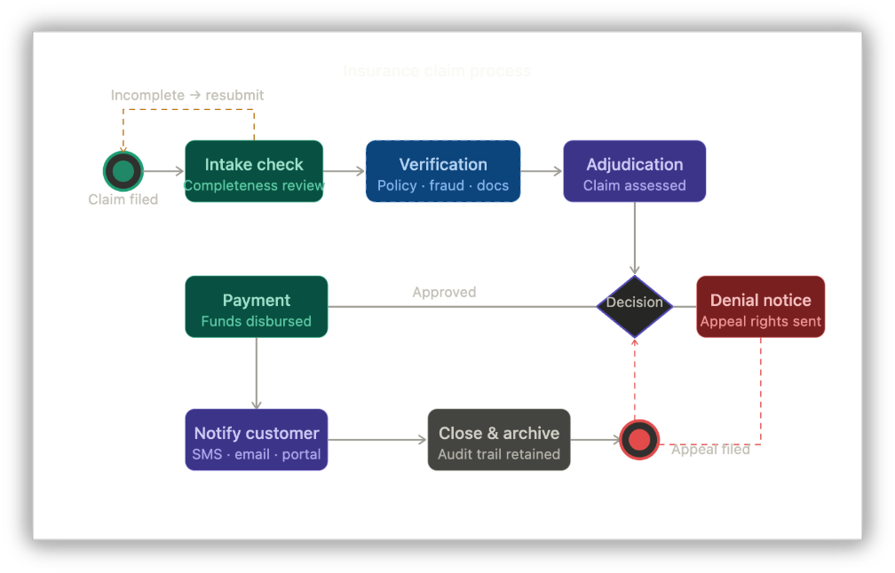 Take an insurance claim process, for example. What seems simple on the surface—a customer files a claim and a decision gets made—becomes much more complex when you factor in parallel verification checks, automated notifications, edge cases, and regulatory requirements.
