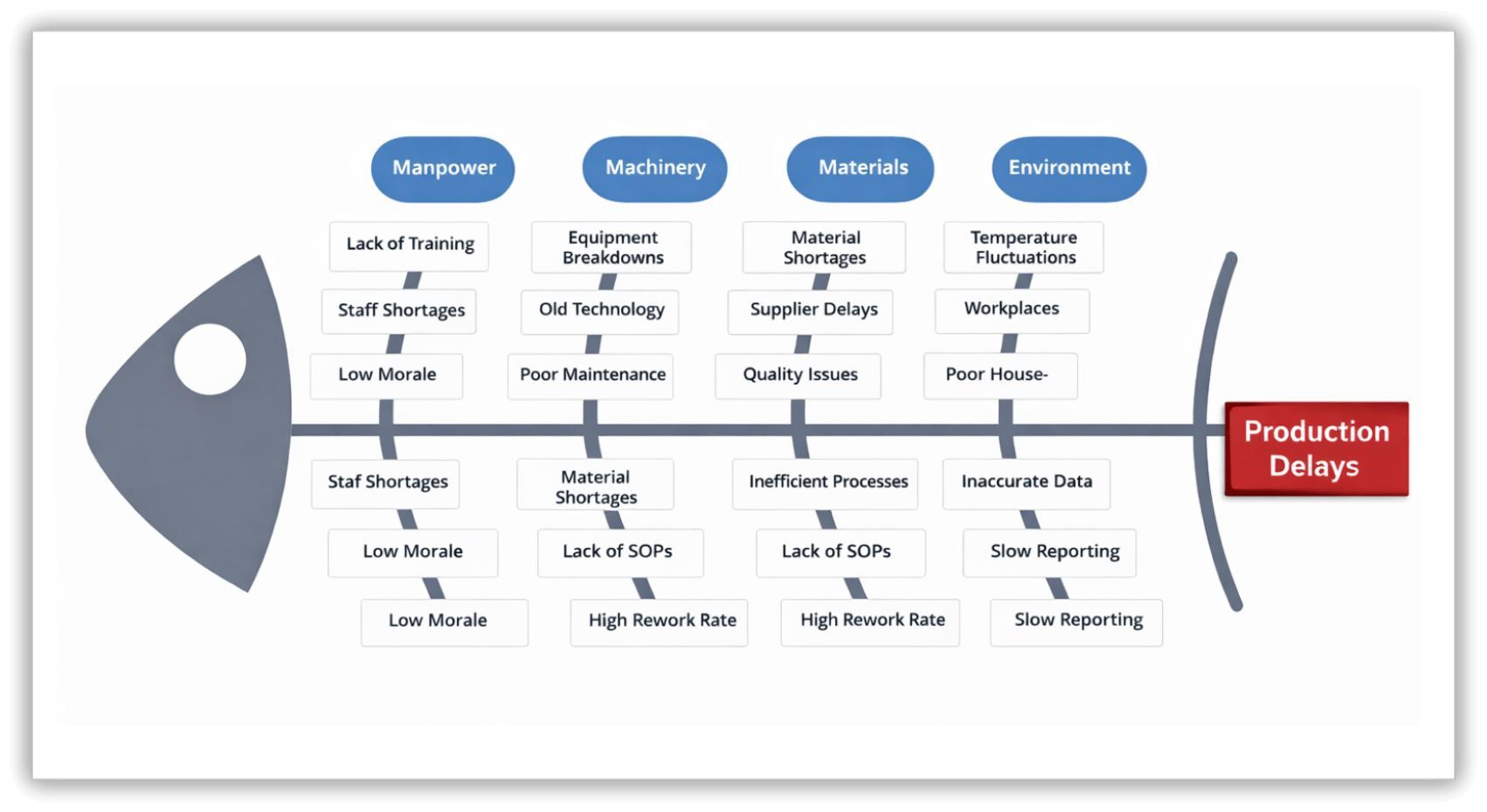 They encourage teams to think across multiple categories at once, which helps avoid the common trap of jumping to the most obvious cause and missing the real one. Categories typically include people, processes, tools, environment, and materials, though these are adjusted to fit whatever situation the team is investigating.