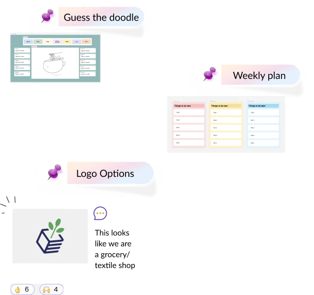 Inicia la conversación en un lienzo infinito de flujo libre donde todos puedan compartir ideas en tiempo real, como texto, notas de voz o notas adhesivas rápidas. Los compañeros de equipo pueden aportar inspiración con imágenes, videos y GIF, dibujar anotaciones a mano alzada y esbozar planes, diagramas de flujo y mapas mentales.