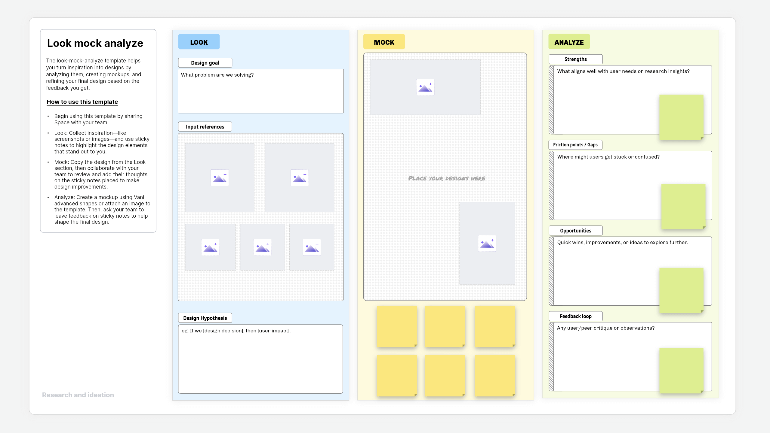 A look-mock-analyze template helps you turn inspiration into designs by analyzing ideas, creating mockups, and refining your final design based on the feedback you get.